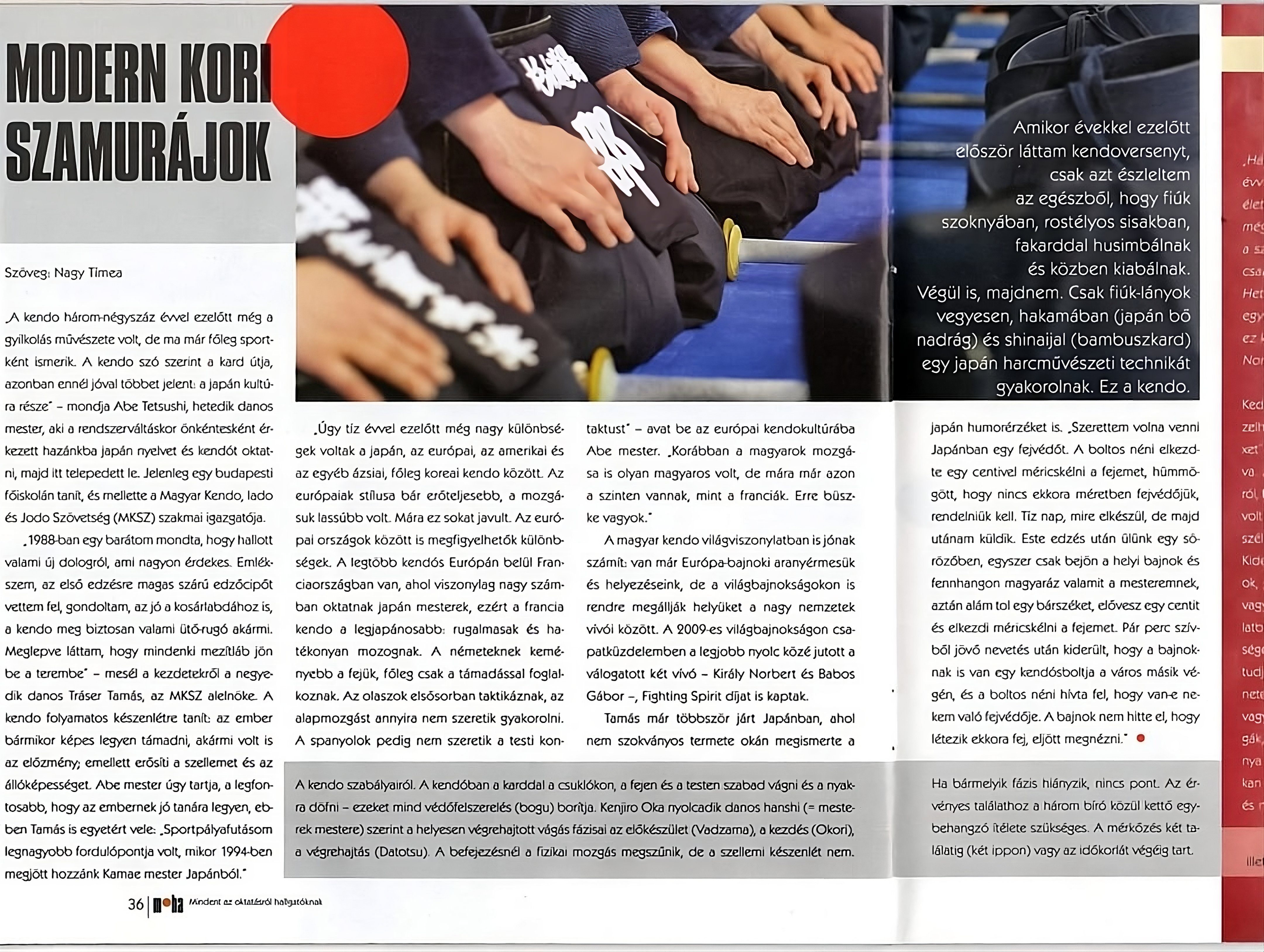 A kendó három-négyszáz évvel ezelőtt még a gyilkolás művészete volt, de ma már főleg sportként ismerik. A kendó szó szerint a kard útja, azonban ennél jóval többet jelent: a japán kultúra része” – mondja Abe Tetsushi, hetedik danos mester, aki a rendszerváltáskor önkéntesként érkezett hazánkba japán nyelvet és kendót oktatni, majd itt telepedett le. Jelenleg egy budapesti főiskolán tanít, és mellette a Magyar Kendo, Iaido és Jodo Szövetség (MKSZ) szakmai igazgatója.
